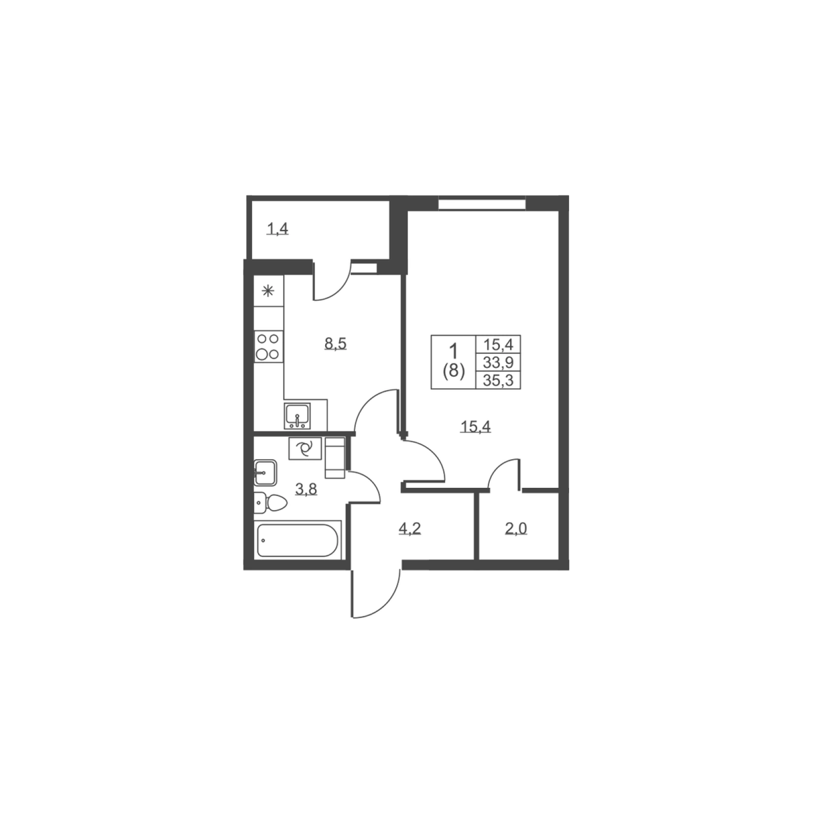 Квартира 1-комнатная №188, 8 этаж